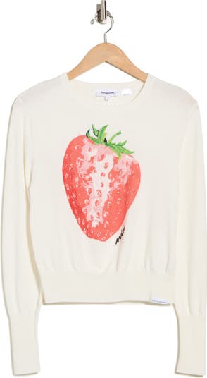 A strawberry-knit design adds sweet appeal to this cozy sweater.