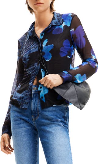 Messages mix with big blooms in this captivating shirt made from airy mesh.