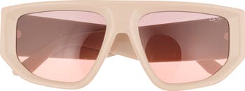 A flat browline lends a retro edge to these statement sunglasses styled with gleaming temple accents and branded lenses.