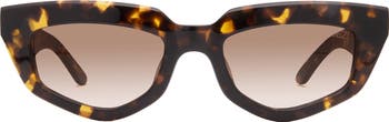An angular cat-eye silhouette lends striking style to slender sunglasses fitted with gleaming metal inlays at the temples.