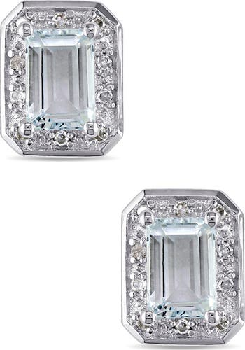 A halo of diamonds surround aquamarine centers on stud earrings crafted from polished sterling silver.