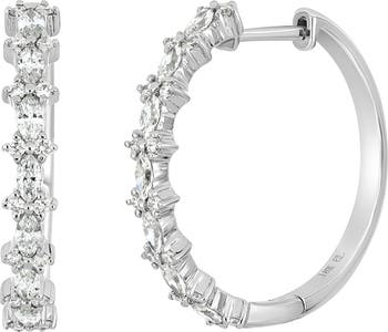 Round and marquis-cut diamonds lend sparkle and shine to these polished hoops shaped from bright 18-karat gold.