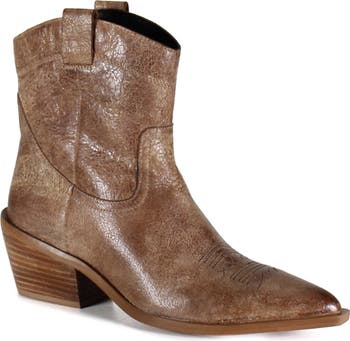 Crackled leather and tonal stitching add unmistakable Western character to a snip-toe boot set on a lightly cushioned footbed.