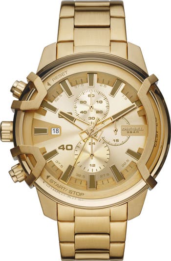 Brushed detailing brings subtle contrast to the dial of this golden bracelet watch outfitted with chronograph functionality.