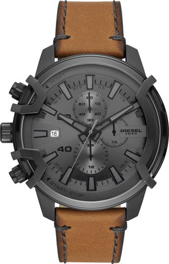 A slim bezel of brushed stainless steel frame a contemporary wristwatch equipped with multi-function dials and a luxurious leather strap.