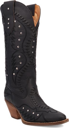 Whipstitch details, embroidery and studs lend a whole lot of charm to this leather Western boot boosted on a stacked heel.