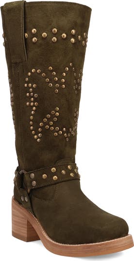Antique studs and a brushed harness buckle make a bold statement against the supple suede exterior of a cushioned knee-high boot lifted by a subtle platform and stacked heel.