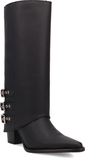 Sophisticated uptown style takes a honky-tonk turn with this Western-style boot featuring a pant-leg shaft secured with moto-inspired buckle straps.