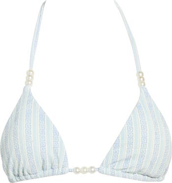 Pearly beads and hues of blue bring delightful detail to this stretchy bikini top done in a timeless triangle silhouette.