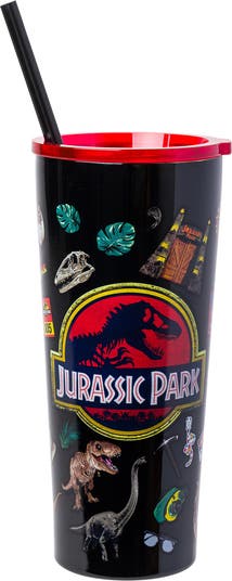 Keep drinks hot or cold for hours with this iconic Jurassic Park tumbler constructed from double-wall insulated stainless steel with a plastic lid and straw.