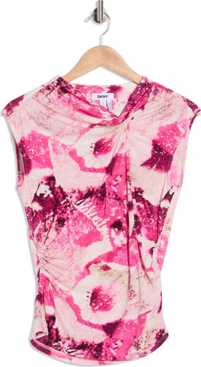 This cap‑sleeve top features an asymmetrical gathered neckline and side ruching that creates a flattering, softly sculpted silhouette.