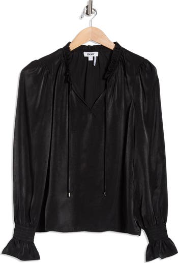A crinkled texture lends depth and dimension to a split-neck top framed by long sleeves with fluttery cuffs to bring a touch of romance to your look.