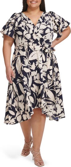 Layered flutter sleeves enhance the romantic whimsy of this floral midi dress fashioned in a charming faux-wrap silhouette.