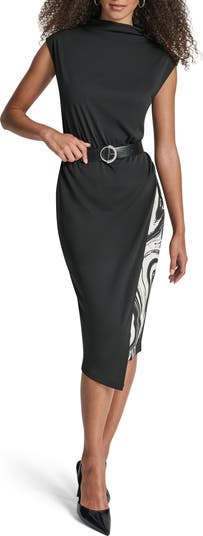 A removable waist belt with a glimmering buckle cinches the silhouette of this sheath dress cut from stretchy fabric, detailed with side ruching and a marble print, that’s perfect for your desk‑to‑dinner looks.