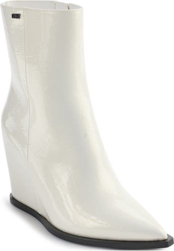 A pointy toe and a towering wedge frame a polished bootie with a shiny finish for added allure.