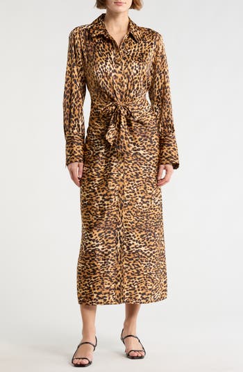 Integrated gathers add a cool, knotted effect at the waist of this slinky satin dress peppered with cheetah spots.