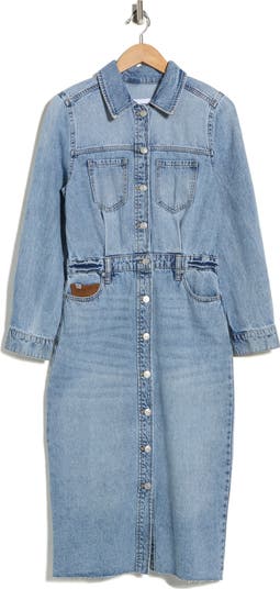 Branded buttons march down the front of this overall-inspired dress cut from weathered, strategically creased denim.