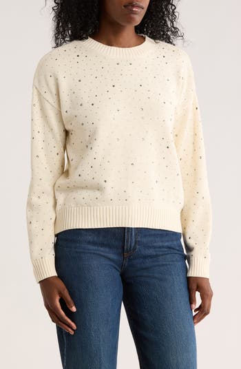 Shimmering rhinestones capture and reflect light with your every movement in a crewneck sweater knit from pure cotton yarn.
