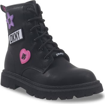 Branded patches bring DKNY's signature swagger to a kid-sized boot built on a flexible, cushioned sole for all-day comfort.