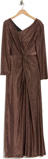 Shimmer at every party and social event in this drapey, metallic gown fashioned with an elegantly gathered, knotted front and a modern asymmetric neckline.