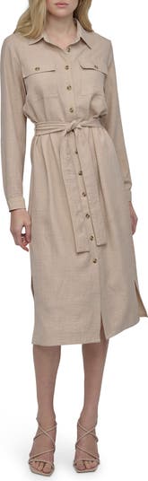 Show off utility-inspired style in this textured long-sleeve shirtdress fashioned with chest pockets and a removable tie belt.