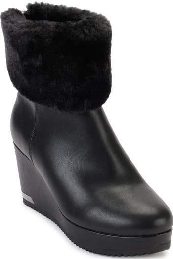 Glam up your look with this elegant platform bootie fashioned with a plush faux-fur cuff and wrapped wedge heel.