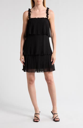 Refresh your date-night style with this pleated chiffon shift dress fashioned with ruffled straps and a playfully tiered silhouette.
