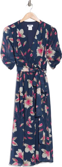 A waist tie defines the faux-wrap silhouette of a woven midi dress that's covered in delightful blooms to sweeten your look.