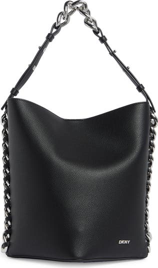 Polished silvertone curb links line down the front of this bucket bag made from pebbled faux leather and outfitted with an adjustable strap.