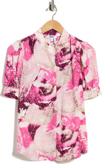 An abstract print brightens this lightweight georgette button-up shirt framed by a sleek band collar and gently puffed sleeves.