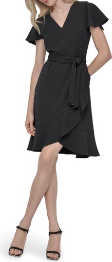 Exude charming style in this belted stretch-crepe dress framed by fluttery sleeves and a ruffled tulip hem.