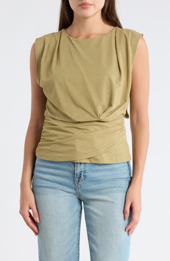 A casual-chic sleeveless top is cut from supersoft stretch-knit fabric and gathered at the front for an eye-catching finish.