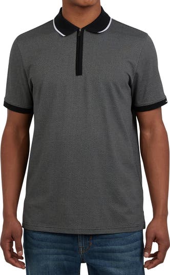 Tipping stripes ring the collar of this subtly textured polo styled with a sleek half-zip placket.