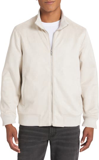 Days with a slight breeze in the air call for the comfort of this bomber jacket fashioned from supple faux suede.