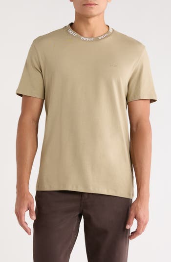 Block-lettering trims the ringer trim of this casual-cool T-shirt cut from comfortable stretch-enhanced cotton.