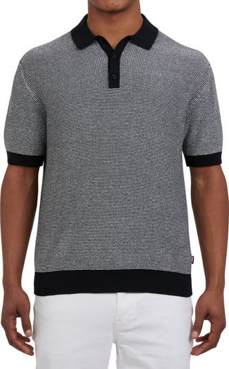 You'll look sharp in a snap in this polo-sweater knit from exceptionally soft cotton in a striped pattern.