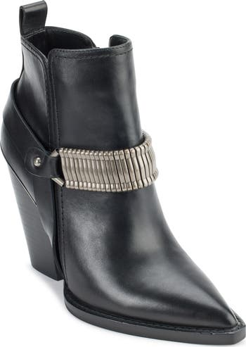 Antiqued metal hardware brings a rustic, well-weathered edge to these Western-inspired ankle boots framed by a sharp pointed toe and stable block heel.