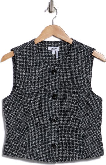Chest faux pockets enhance the polished style of this textural tweed vest fashioned in a fitted, cropped silhouette.