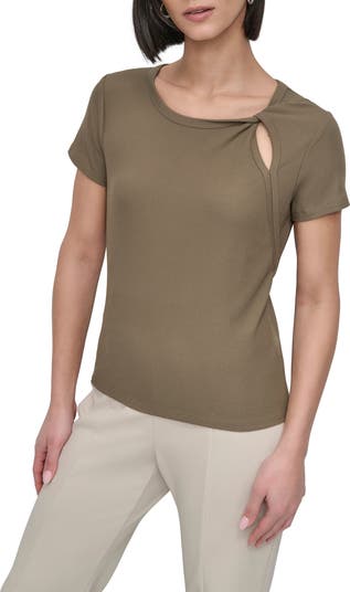 Give your stack of classic crewnecks the day off with this ribbed option finished with a cutout twist at the neck for an elevated addition to its casual comfort.