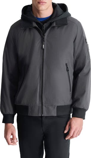 Stay warm in this water-resistant bomber jacket constructed with a removable hooded bib for a layered effect.