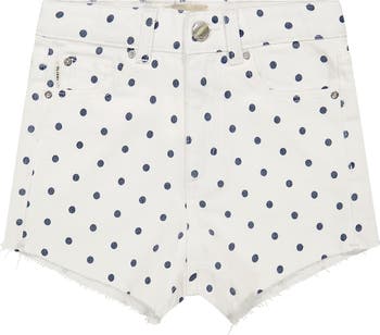 A charming dot pattern lends whimsical charm to a signature pair of denim shorts that are a must-have in their warm-weather rotation.