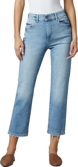 Vintage-inspired sanding and grinding define a pair of straight-leg jeans that are crafted from soft stretch denim and finished in a fresh medium-blue wash.