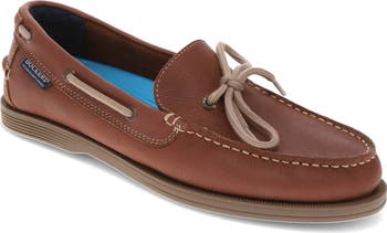 Woven laces wrap a smooth leather boat shoe set on a cushioned footbed for allday comfort.