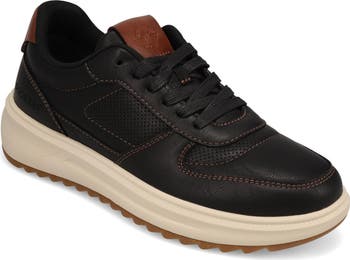 A streamlined faux-leather upper with breezy perforated detailing defines a low-profile sneaker built with a moisture-wicking interior and cushioned footbed for day-to-night comfort.