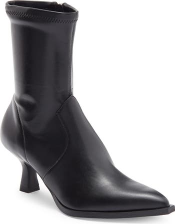 Update your cold-weather looks with this ankle-length bootie perched upon a flared heel and styled with a pointed toe.