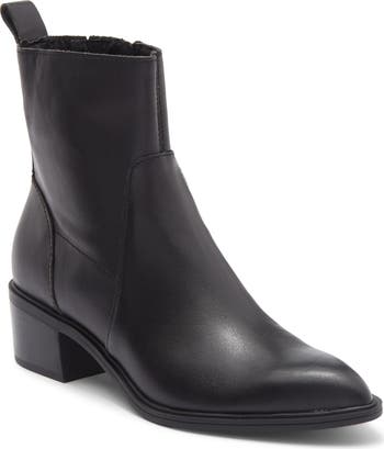 A pointy toe and block heel balance a sleek leather bootie fashioned with a side zipper for easy entry.