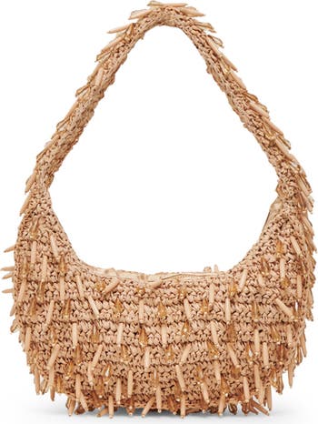 Beaded embellishments add plenty of texture and dimension to this resort-worthy shoulder bag woven from natural raffia.