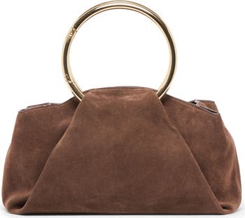 Goldtone ring handles add luster and dimension to a slouchy suede bag featuring a roomy interior and optional crossbody strap for hands-free convenience.