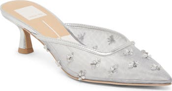 Shimmering beaded flowers illuminate the mesh upper of this event-ready pump framed with a pointy toe and sculptural kitten heel.