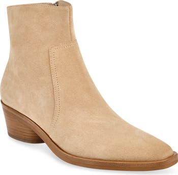A pointed toe is balanced by a circular heel in this sleek leather bootie.